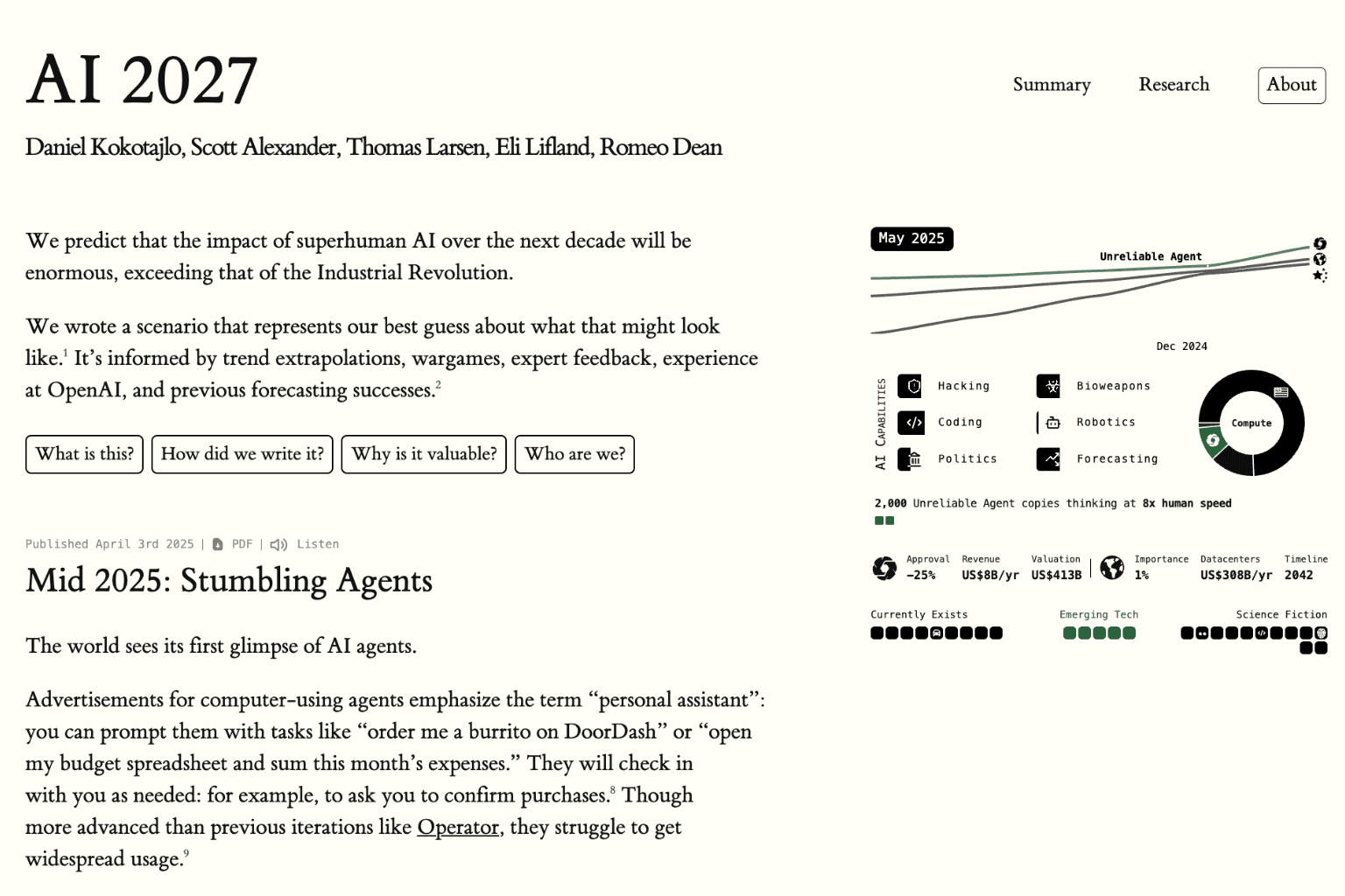 - AI 2027 er verdt timene det tar å lese. Det konkretiserer mange av de implisitte forutsetningene i mange fremtidsscenarioer. Ikke minst kan det informere kritikere om hvilke betingelser som er tvilsomme.