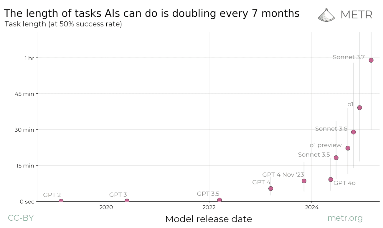Forskningsenteret METR har undersøkt hvor lange oppgaver forskjellige KI-modeller klarer å løse uten å gjøre feil. Lengden på oppgaven er målt opp mot hvor lang tid en menneskelig ekspert ville brukt på samme oppgave, som for eksempel tiden det tar å svare på et spørsmål eller telle ord i et avsnitt.